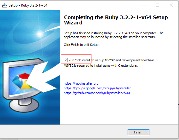 Install using the default setting and ensure the option to “Run ‘ridk install” is checked. Click on Finish