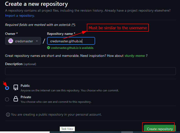 Under Repository name, enter the name of your github page. Syntax: your_github_username.github.io
